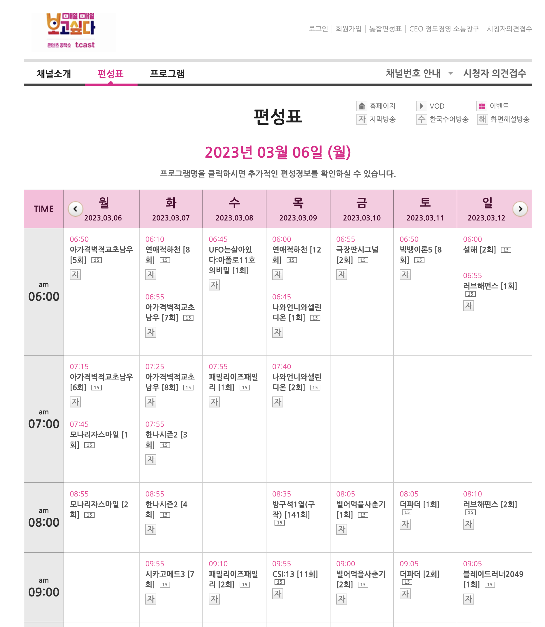 μμ λ§ν¬λ₯Ό ν΄λ¦νμ¬ μ¨λ€νμ λ€μ΄κ°μλ©΄ μμ κ°μ΄ λ§€μΌ μ 곡λλ μν νλ‘κ·Έλ¨μ νμΈνμ€ μ μμ΅λλ€. κ°κ°μ νλ‘κ·Έλ¨λͺ μ ν΄λ¦νμλ©΄ μμΈν νΈμ±μ 보λ₯Ό νμΈνμ€ μ μκΈ° λλ¬Έμ μ리μ¦λ¬Όμ κ²½μ° λ€μ νΈμ΄ μΈμ  λ°©μλλμ§κΉμ§ νΈλ¦¬νκ² νμΈνμ€ μ μμ΅λλ€.