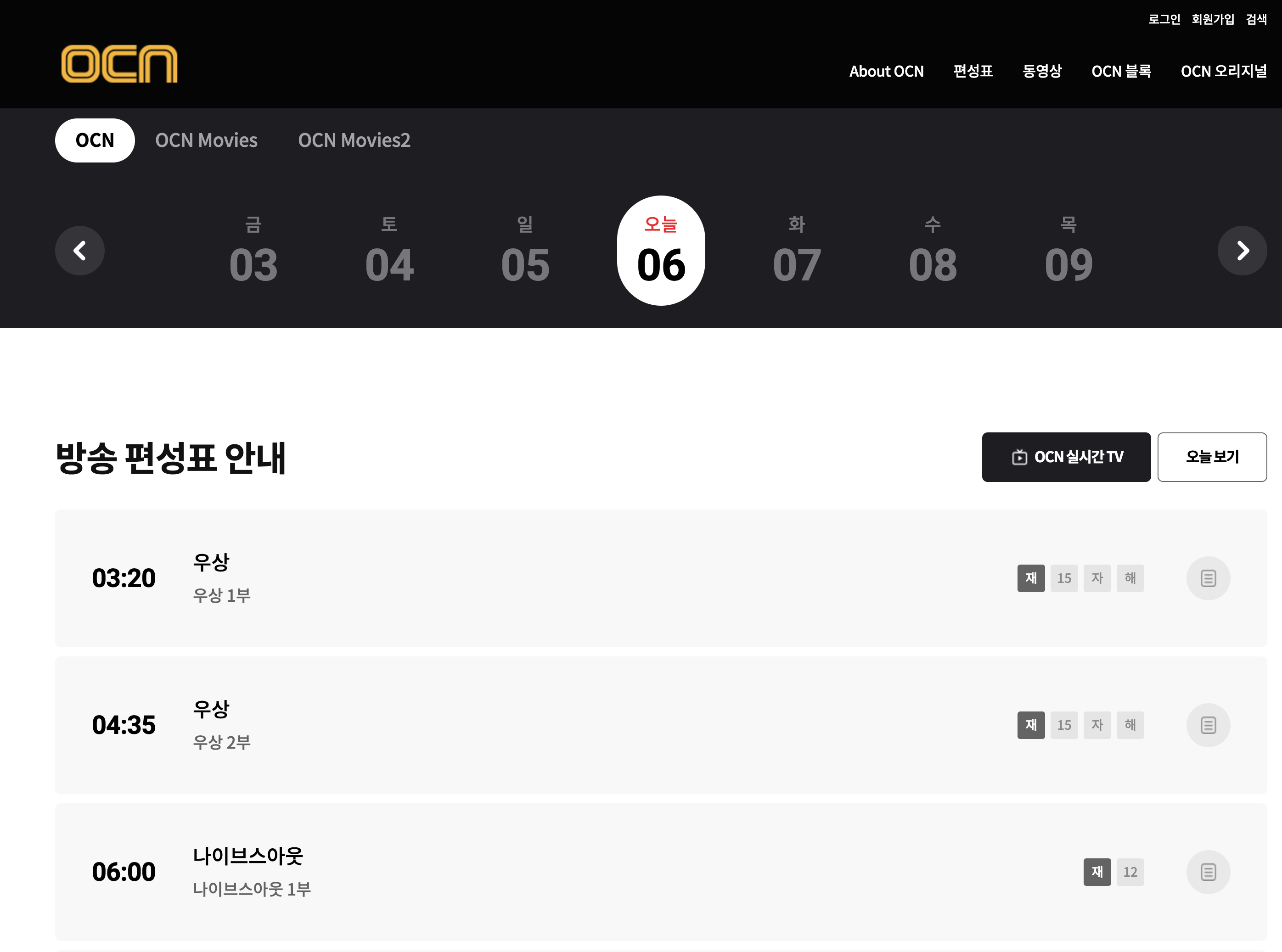 OCN νΈμ±νμ λ€μ΄κ°λ³΄μλ©΄ OCNκ³Ό OCN Movies, OCN Movies2κΉμ§ νΈμ±νλ₯Ό λͺ¨λ νμΈνμ€ μ μμ΅λλ€. λ§μ°¬κ°μ§λ‘ νΈμ±νμ νΈμ±λ μν μ 보μ μ€λ₯Έμͺ½ λ λ ΈνΈνμλ₯Ό ν΄λ¦νμλ©΄ ν΄λΉ μνμ λν μμΈν μ λ³΄κ° μ 곡λ©λλ€.