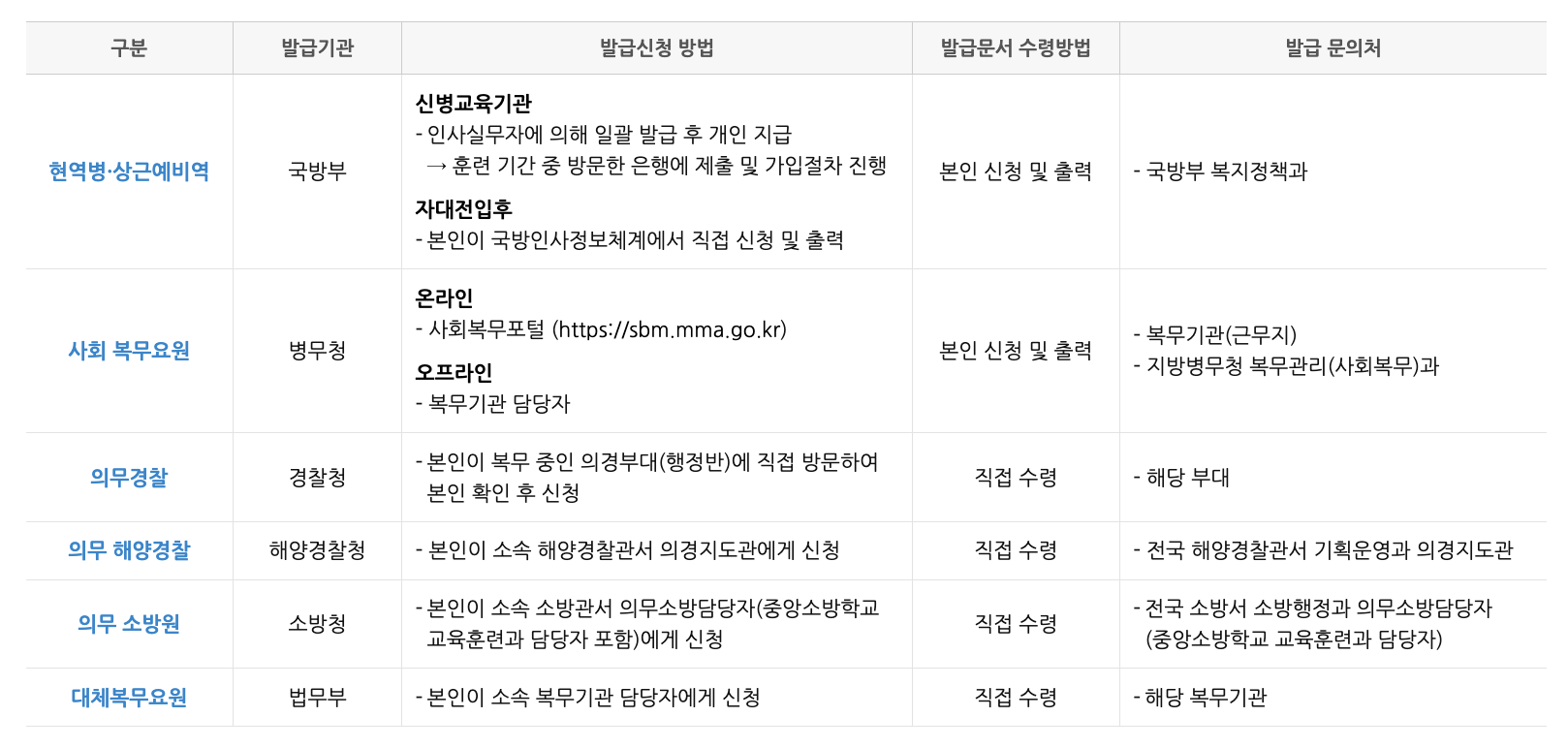 - ๊ฐ์ ๋์: ํ์ญ๋ณ/์๊ทผ์๋น์ญ/์๋ฌด๊ฒฝ์ฐฐ/ํด์์๋ฌด๊ฒฝ์ฐฐ/์๋ฌด์๋ฐฉ์/์ฌํ๋ณต๋ฌด์์/๋์ฒด๋ณต๋ฌด์์