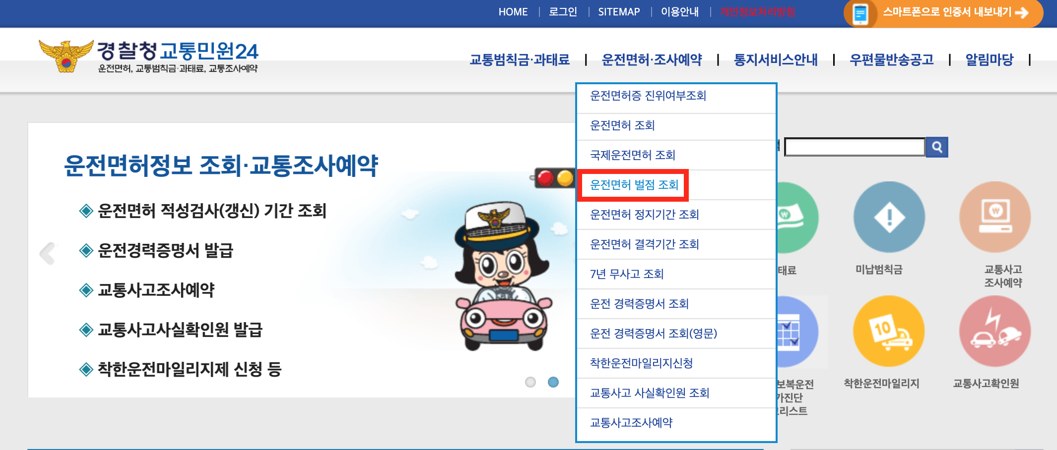 ์ด์ ๋ฉดํ ๋ฒ์ ์ ์กฐํํ๋ ๋ฐฉ๋ฒ์๋ 2๊ฐ์ง๊ฐ ์์ต๋๋ค. ๊ฐ์ฅ ๋ง์ ์ฌ๋๋ค์ด ์ด์ฉํ์๋ ๊ฒ์ด ๋ฐ๋ก ๊ฒฝ์ฐฐ์ฒญ์์ ์ ๊ณตํ๋ ๊ตํต๋ฏผ์24์ ๋๋ค. ๊ตํต๋ฏผ์ 24์ ์ ์ํ์ ํ, ์๋จ์ ์ด์ ๋ฉดํ·์กฐ์ฌ์์ฝ์ ๋ค์ด๊ฐ์๋ฉด ์ด์ ๋ฉดํ ๋ฒ์ ์กฐํ๋ฅผ ํ์ค ์ ์์ต๋๋ค. ๋ก๊ทธ์ธ์ ์นด์นด์คํก์ด๋ ๋ค์ด๋ฒ ์์ด๋๋ฅผ ๊ฐ์ง๊ณ ๊ณ์ ๊ฒฝ์ฐ ๊ฐํธ ๋ก๊ทธ์ธ๋ ๊ฐ๋ฅํ๊ธฐ ๋๋ฌธ์ ํธ๋ฆฌํ๊ฒ ํ์ธํ์ค ์ ์์ต๋๋ค.