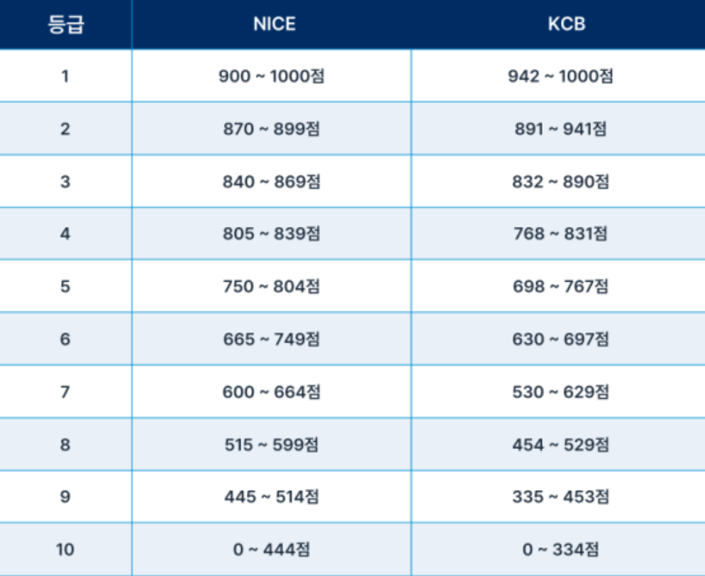 ์์ ์๋ ์ ์ฉ๋ฑ๊ธ(1~10๋ฑ๊ธ)์ ํ์ฉํ์์ผ๋ ํ์ฌ๋ ์ ์ฉ๋ฑ๊ธ์ด ์๋ ์ ์ฉ์ ์๋ง์ ํ์ฉํ๊ณ ์์ผ๋ฉฐ KCB๋ 942์ , NICE๋ 900์ ์ด์์ด๋ฉด ์ ์ฉ๋ฑ๊ธ 1๋ฑ๊ธ์ ๋๋ค.