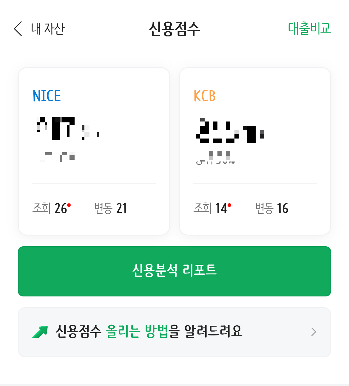 ์์ ํ๊ฐ์์ ์ค, ์ ์ฉ๊ฑฐ๋ํํ, ๋ถ์ฑ์์ค๊ณผ ์ํ์ด๋ ฅ์ ํฐ ๋น์ค์ ๋๊ณ ์ ์ฉ์ ์๋ฅผ ํ๊ฐํ๊ธฐ ๋๋ฌธ์ ์ด ๋ถ๋ถ์ ์ ๊ด๋ฆฌํ์๋ฉด ์ ์ฉ์ ์๋ฅผ ๋๊ฒ ๊ด๋ฆฌํ์ค ์ ์์ต๋๋ค. NICE๋ ์ํ์ด๋ ฅ๊ณผ ์ ์ฉ๊ฑฐ๋ํํ๋ฅผ, KCB๋ ์ ์ฉ๊ฑฐ๋ํํ๋ฅผ ์ฃผ๋ก ์ ์ฉ์ ์์ ๋ฐ์ํ๋ค๊ณ ํฉ๋๋ค.