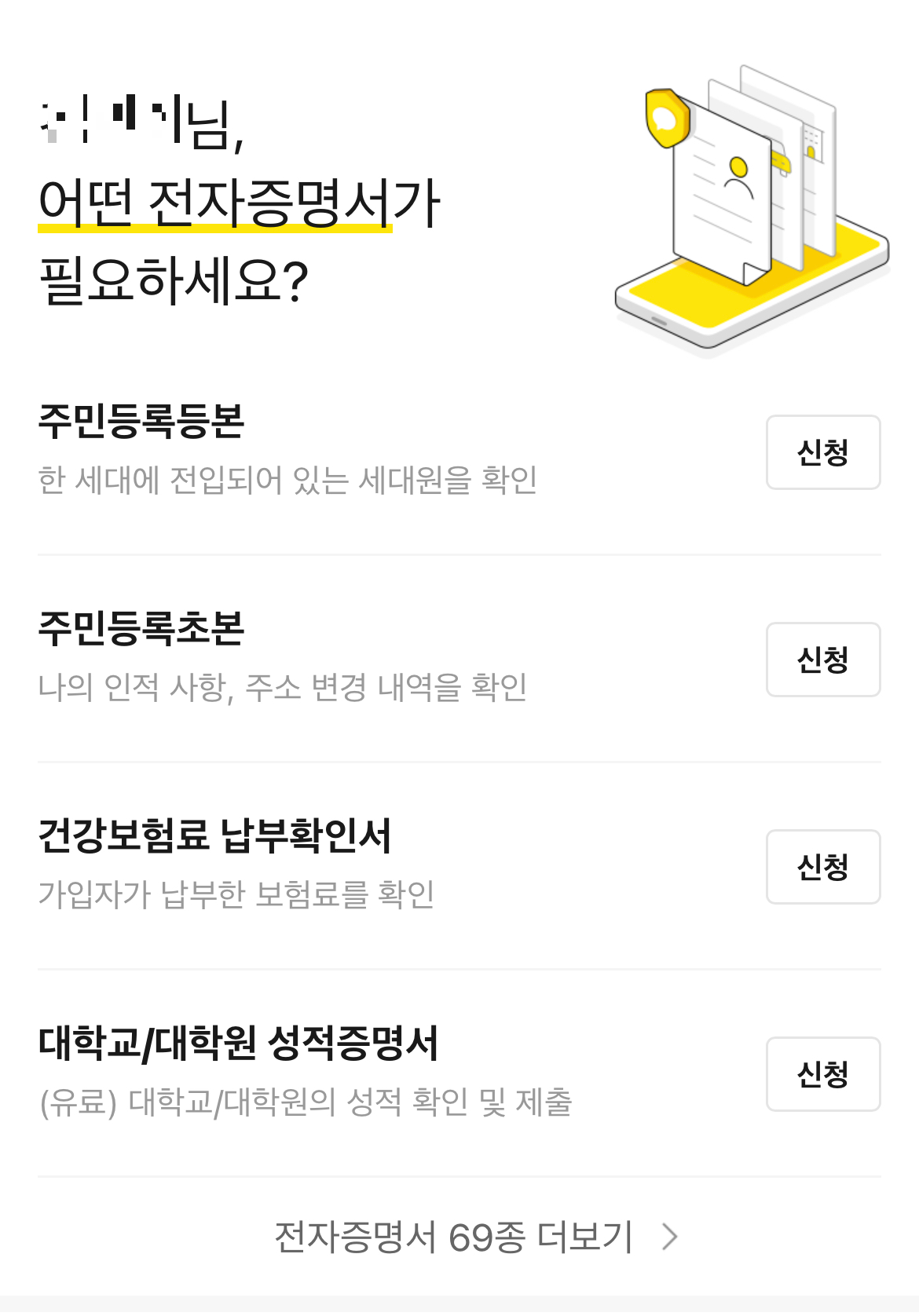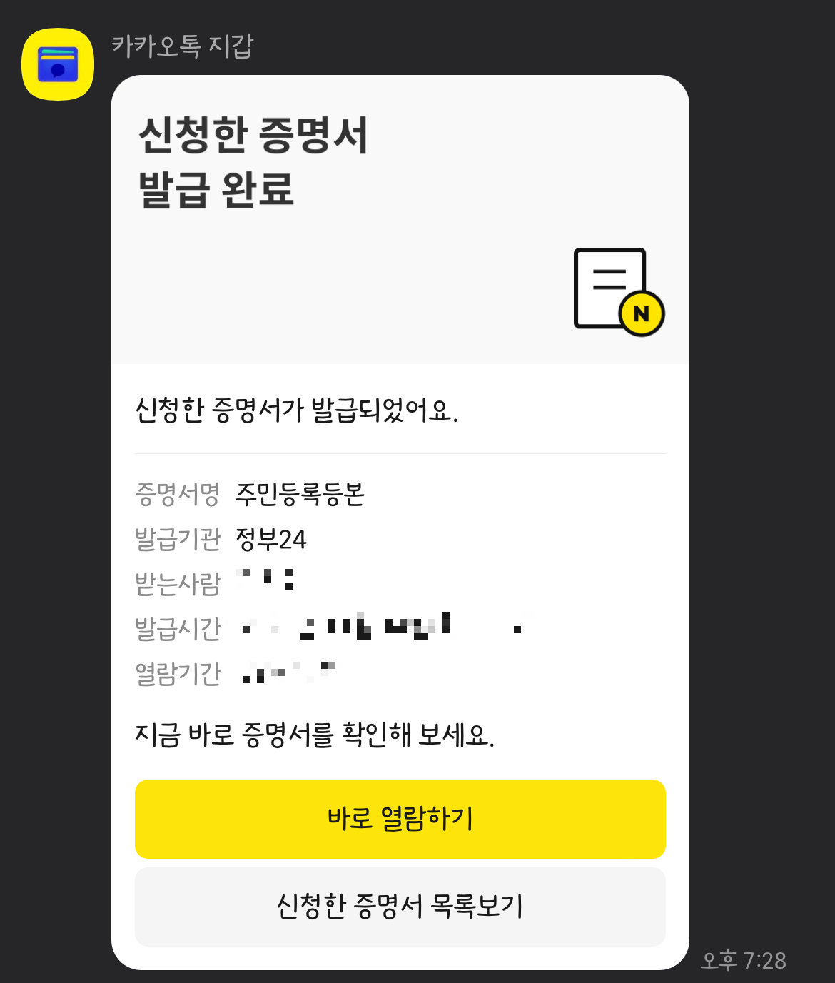 ์นด์นด์˜คํ†ก์„ ์ด์šฉํ•˜๋ฉด ์ฃผ๋ฏผ๋“ฑ๋ก๋“ฑ๋ณธ ๋ฟ๋งŒ ์•„๋‹ˆ๋ผ 69์ข…์˜ ๋‹ค์–‘ํ•œ ์ „์ž์ฆ๋ช…์„œ๋ฅผ ๋ฐœ๊ธ‰๋ฐ›์œผ์‹ค ์ˆ˜ ์žˆ์Šต๋‹ˆ๋‹ค. ๋งˆ์ง€๋ง‰์— [์ €์žฅํ•˜๊ธฐ]๋ฅผ ๋ˆ„๋ฅด์‹œ๋ฉด ํœด๋Œ€ํฐ์— ํ•ด๋‹น ์ฆ๋ช…์„œ๊ฐ€ ์‚ฌ์ง„์˜ ํ˜•ํƒœ๋กœ ์ €์žฅ๋˜๊ธฐ ๋•Œ๋ฌธ์— ์นด์นด์˜คํ†ก์„ ์ด์šฉํ•˜์—ฌ ์ „์†กํ•˜๊ฑฐ๋‚˜ ํœด๋Œ€ํฐ์—์„œ ํ”„๋ฆฐํŠธํ•˜์‹ค ์ˆ˜ ์žˆ์Šต๋‹ˆ๋‹ค. ์นด์นด์˜คํ†ก ๋ฉ”์‹œ์ง€๋ฅผ ํ™•์ธํ•ด๋ณด์‹œ๋ฉด ๋ฐœ๊ธ‰๋œ ์ฃผ๋ฏผ๋“ฑ๋ก๋“ฑ๋ณธ์„ ๋‹ค์‹œ ํ™•์ธํ•˜์‹ค ์ˆ˜ ์žˆ์Šต๋‹ˆ๋‹ค.
