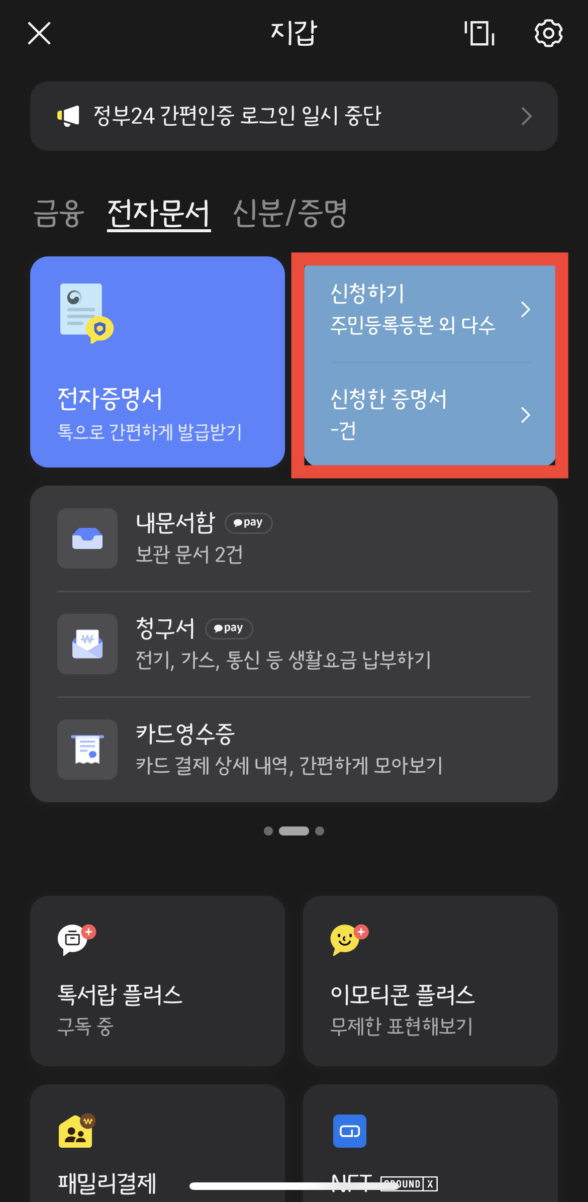 ์นด์นด์คํก์ ์ด์ฉํ๋ฉด ์ฃผ๋ฏผ๋ฑ๋ก๋ฑ๋ณธ ๋ฟ๋ง ์๋๋ผ 69์ข ์ ๋ค์ํ ์ ์์ฆ๋ช ์๋ฅผ ๋ฐ๊ธ๋ฐ์ผ์ค ์ ์์ต๋๋ค. ๋ง์ง๋ง์ [์ ์ฅํ๊ธฐ]๋ฅผ ๋๋ฅด์๋ฉด ํด๋ํฐ์ ํด๋น ์ฆ๋ช ์๊ฐ ์ฌ์ง์ ํํ๋ก ์ ์ฅ๋๊ธฐ ๋๋ฌธ์ ์นด์นด์คํก์ ์ด์ฉํ์ฌ ์ ์กํ๊ฑฐ๋ ํด๋ํฐ์์ ํ๋ฆฐํธํ์ค ์ ์์ต๋๋ค. ์นด์นด์คํก ๋ฉ์์ง๋ฅผ ํ์ธํด๋ณด์๋ฉด ๋ฐ๊ธ๋ ์ฃผ๋ฏผ๋ฑ๋ก๋ฑ๋ณธ์ ๋ค์ ํ์ธํ์ค ์ ์์ต๋๋ค.