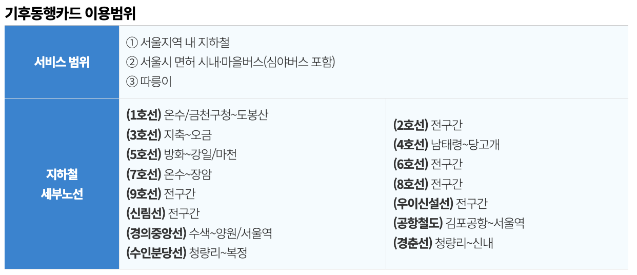 ๊ธฐํ๋ํ์นด๋๋ ์์ธ์์์ ์ดํํ๋ ๋์ค๊ตํต๊ณผ ๋ฐ๋ฆ์ด์ ํํด ์ด์ฉ์ด ๊ฐ๋ฅํฉ๋๋ค. ์์ธ์์ ์ถ๋ฐํ๋ ๋์ค๊ตํต์ ํ์นํ์ ๊ฒฝ์ฐ๋ผ๋ฉด ๊ฒฝ๊ธฐ๋๋ ์ธ์ฒ์์ ํ์ฐจํ ๊ฒฝ์ฐ๋ผ๋ ์ด์ฉ์ด ๊ฐ๋ฅํ์ง๋ง ๋ฐ๋์ ๊ฒฝ์ฐ์๋ ํํ ์ ์ฉ์ด ๋์ง ์์ต๋๋ค. ๋ฒ์ค์ ๊ฒฝ์ฐ์๋ ๋ฒ์ค ๋ฉดํ์ง๊ฐ ์์ธ์ธ ๊ฒฝ์ฐ์๋ง ํํ์ด ์ ์ฉ๋๋ฏ๋ก ํ์นํ๋ ๋ฒ์ค์ ์ ๋ณด๋ฅผ ์ ์์๋ณด๊ณ ํํ ์ ์ฉ์ฌ๋ถ๋ฅผ ํ์ธํ์๋ฉด ์ข์ ๊ฒ ๊ฐ์ต๋๋ค.