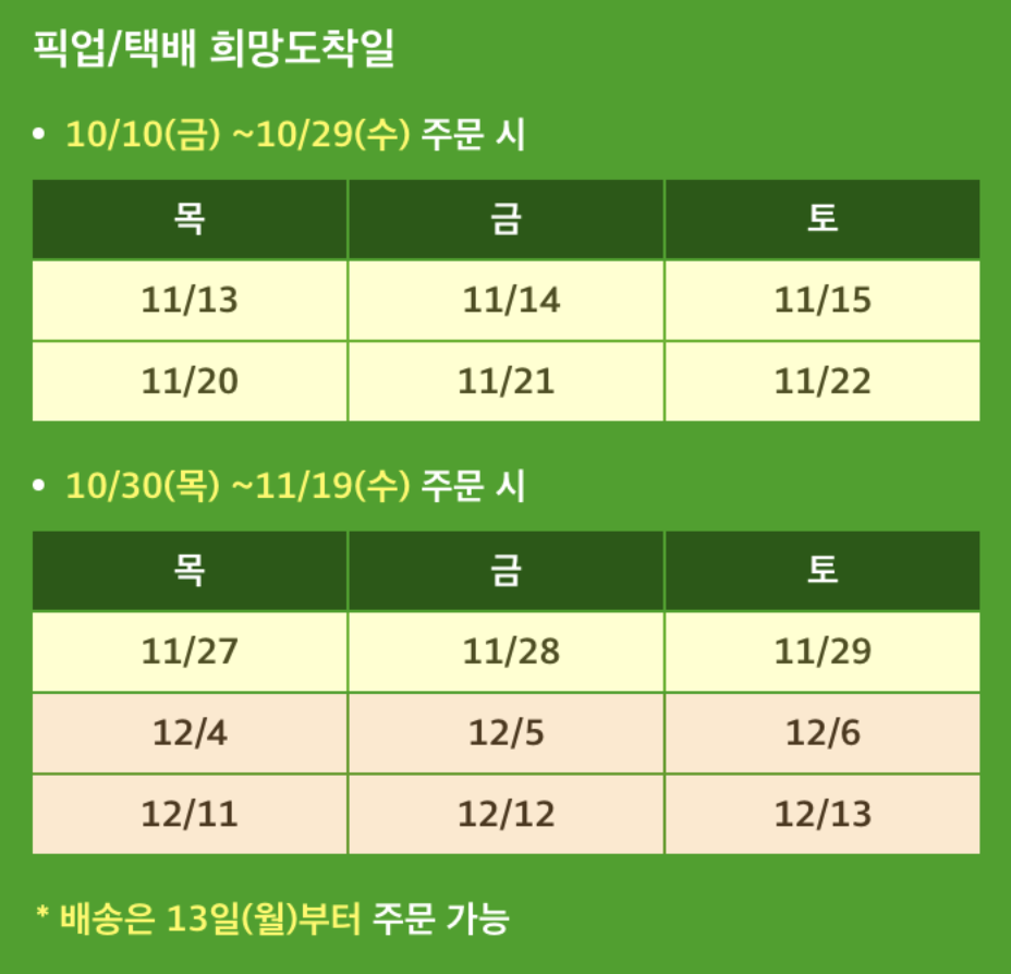 | ์๋ น ๊ธฐ๊ฐ | 11์ 13์ผ(๋ชฉ) ~ 11์ 22์ผ(ํ ) | 11์ 27์ผ(๋ชฉ) ~ 12์ 13์ผ(ํ ) |