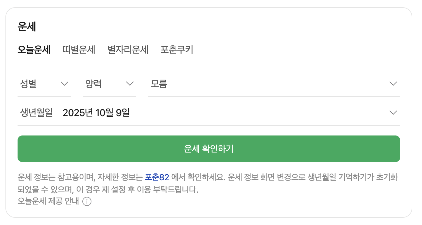 ๋ค์ด๋ฒ ์ด์ธ 2025๋ ๋ค์ด๋ฒ ํฌํธ์์ ์ ๊ณตํ๋ ๊ณต์ ๋ฌด๋ฃ ์ด์ธ ์๋น์ค์ ๋๋ค. ๋ณ๋์ ํ์๊ฐ์ ์์ด ๊ฐ๋จํ ์ ๋ ฅ๋ง์ผ๋ก ๋ ๋ณ ์ด์ธ, ๋ณ์๋ฆฌ ์ด์ธ, ์ค๋์ ์ด์ธ, ์ ๋ ์ด์ธ ๋ฑ ๋ค์ํ ํญ๋ชฉ์ ํ์ธํ ์ ์์ต๋๋ค. ํนํ, ํ์ด๋ ์ฐ๋๋ ์์ผ์ ์ ๋ ฅํ๋ฉด ์ด์ด, ๊ธ์ ์ด, ์ ์ ์ด, ์ง์ฅ์ด ๋ฑ ์ธ๋ถ ํญ๋ชฉ๋ณ๋ก ํ์ด๊ฐ ์ ๊ณต๋ฉ๋๋ค.