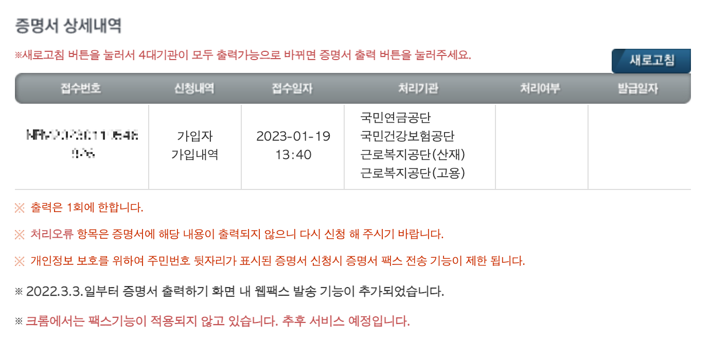 ์ ์ฒญ๋ฒํผ์ ๋๋ฅด๊ณ ๋๋ฉด ์๋์ ๊ฐ์ด ์ฆ๋ช ์ ์์ธ๋ด์ญ์ด ๋์ค๊ณ ์ค๋ฅธ์ชฝ๊ณผ ๊ฐ์ด ์ฒ๋ฆฌ์ฌ๋ถ์ [์ถ๋ ฅ๊ฐ๋ฅ] ๋ฉ์์ง๊ฐ ๋์ค๋ฉด ํ๋จ์ ์ถ๋ ฅ ๋ฒํผ์ ๋๋ฌ ์ถ๋ ฅ์ด ๊ฐ๋ฅํฉ๋๋ค. ์ฝ 2~3์ด ์ ๋ ๊ธฐ๋ค๋ฆฐ ํ์ [์๋ก๊ณ ์นจ]์ ๋๋ฅด์๋ฉด [์ถ๋ ฅ๊ฐ๋ฅ] ๋ฉ์์ง๊ฐ ๋์ค๊ฒ ๋ฉ๋๋ค.