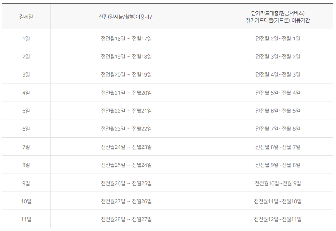 ์šฐ๋ฆฌ์นด๋“œ ๊ฒฐ์ œ์ผ๋ณ„ ์ด์šฉ๊ธฐ๊ฐ„ํ‘œ