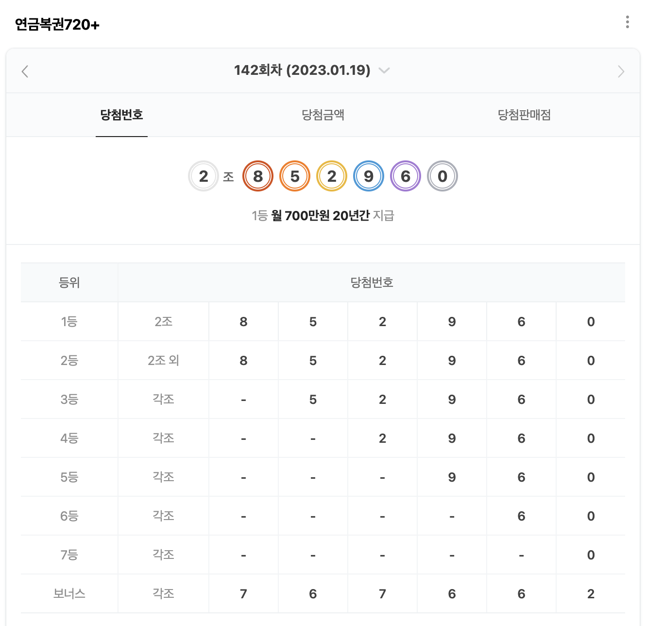 142ํ ์ฐ๊ธ๋ณต๊ถ 720+ ๋น์ฒจ๋ฒํธ