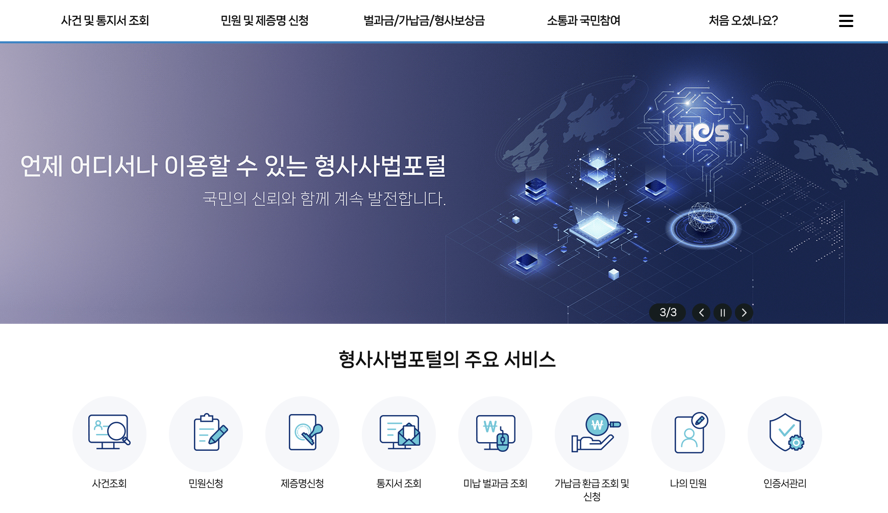 ํ˜•์‚ฌ์‚ฌ๋ฒ•ํฌํ„ธ์€ ๊ฒฝ์ฐฐ·๊ฒ€์ฐฐ·๋ฒ•์› ์‚ฌ๊ฑด์„ ํ†ตํ•ฉ ์กฐํšŒํ•  ์ˆ˜ ์žˆ๋Š” ๊ณต์‹ ํ”Œ๋žซํผ์ž…๋‹ˆ๋‹ค. ๊ณ ์†Œ์ธ, ํ”ผํ•ด์ž, ํ”ผ์˜์ž ๋ชจ๋‘ ๋ณธ์ธ ์ธ์ฆ๋งŒ ํ•˜๋ฉด ์‚ฌ๊ฑด ์ง„ํ–‰ ์ƒํ™ฉ์„ 24์‹œ๊ฐ„ ํ™•์ธํ•  ์ˆ˜ ์žˆ์Šต๋‹ˆ๋‹ค.