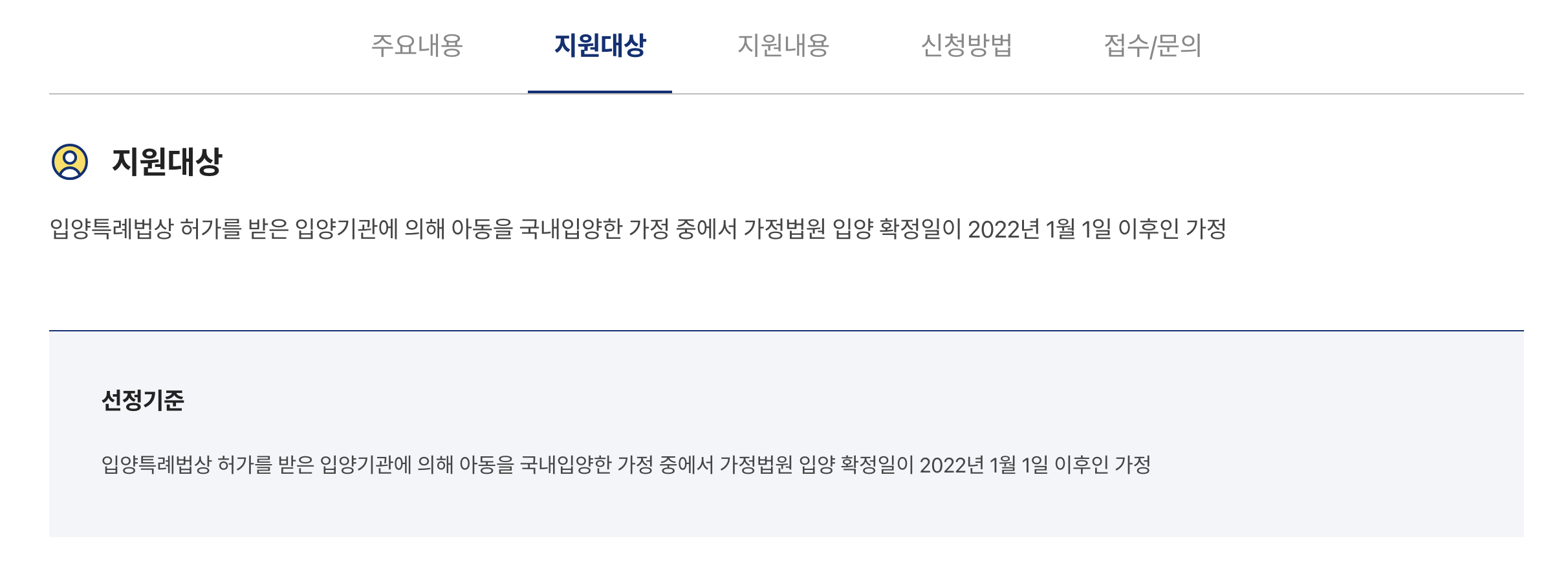 μ„ μ •κΈ°μ€€ 및 μ§€μ›λŒ€μƒ μž…μ–‘νŠΉλ‘€λ²•μƒ ν—ˆκ°€λ₯Ό 받은 μž…μ–‘κΈ°κ΄€μ— μ˜ν•΄ 아동을 κ΅­λ‚΄μž…μ–‘ν•œ κ°€μ • 쀑,