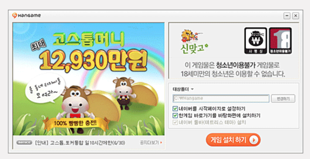 ํ•œ๊ฒŒ์ž„ ์‹ ๋งž๊ณ ๋ฅผ ์„ค์น˜ํ•˜๊ธฐ ์œ„ํ•ด์„œ๋Š” ์œ„์˜ ํ™”๋ฉด ์ค‘, ์•„๋ฌด ๊ฒฝ๊ธฐ์žฅ์ด๋‚˜ ํ•˜๋‚˜๋ฅผ ์„ ํƒํ•˜์—ฌ ์ž…์žฅํ•˜์‹œ๋ฉด ์•„๋ž˜์™€ ๊ฐ™์€ ์„ค์น˜ ํ”„๋กœ๊ทธ๋žจ์ด ์ž๋™์œผ๋กœ ์‹œ์ž‘๋ฉ๋‹ˆ๋‹ค.