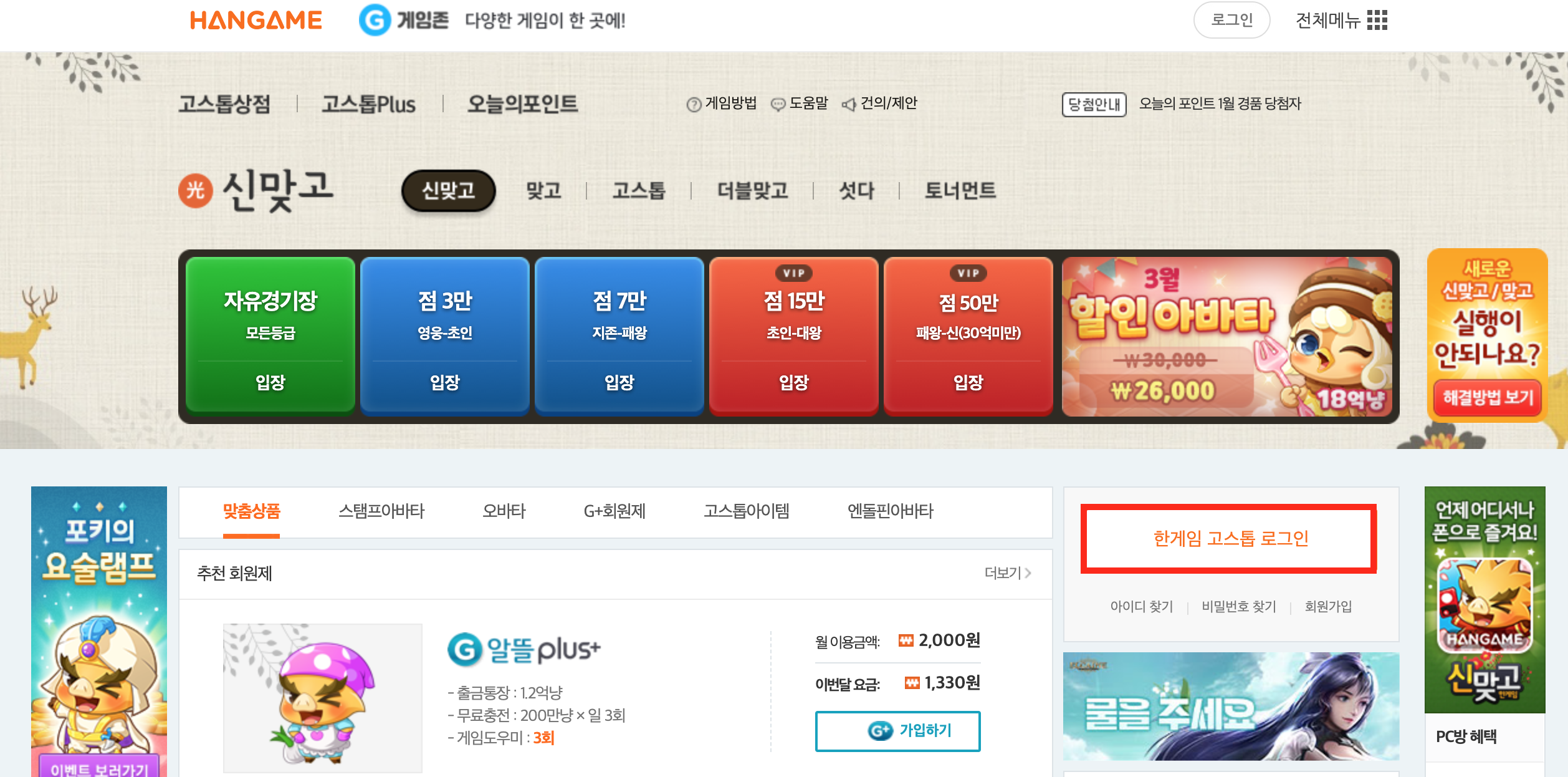 ํ•œ๊ฒŒ์ž„ ์‹ ๋งž๊ณ  ํ™ˆํŽ˜์ด์ง€์— ์ ‘์†ํ•˜์…จ๋‹ค๋ฉด ์˜ค๋ฅธ์ชฝ ์ค‘๊ฐ„์— [ํ•œ๊ฒŒ์ž„ ๊ณ ์Šคํ†ฑ ๋กœ๊ทธ์ธ]์„ ํด๋ฆญํ•˜์—ฌ ๋กœ๊ทธ์ธ์„ ํ•ฉ๋‹ˆ๋‹ค. ํ•œ๊ฒŒ์ž„ ์‹ ๋งž๊ณ ๋Š” 19์„ธ ์ด์ƒ ์ด์šฉ๊ฐ€๋Šฅํ•˜๋ฉฐ ๋ณ„๋„์˜ ํšŒ์›๊ฐ€์ž… ์—†์ด๋„ PAYCO, ๋„ค์ด๋ฒ„, ๊ตฌ๊ธ€, ํŽ˜์ด์Šค๋ถ ์•„์ด๋””๋ฅผ ๊ฐ€์ง€๊ณ  ์žˆ๋‹ค๋ฉด ์‰ฝ๊ฒŒ ๋กœ๊ทธ์ธํ•˜์‹ค ์ˆ˜ ์žˆ์Šต๋‹ˆ๋‹ค.