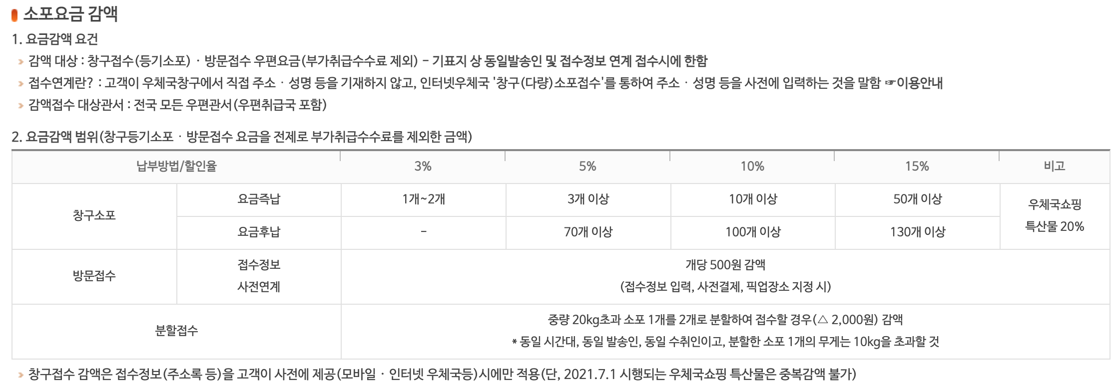 ์ฐ์ฒด๊ตญ์์ ์ํฌ๋ ํ๋ฐฐ๋ฅผ ๋ณด๋ผ ๊ฒฝ์ฐ, ํด๋ํฐ ์ดํ์ ์ด์ฉํ์ฌ ๋ฏธ๋ฆฌ ์์ฝํ๊ณ ๊ฐ๊ฑฐ๋ ์๊ธ ์ฆ๋ฉ์ ์ ํํ์๋ฉด ์ํฌ์ ๊ฐฏ์์ ๋ฐ๋ผ ํ ์ธ์ ๋ฐ์ผ์ค ์ ์์ต๋๋ค. ์ฐฝ๊ตฌ์ ๋ฐฉ๋ฌธํ์ฌ ์ํฌ๋ฅผ ๋ณด๋ด์ค ๊ฒฝ์ฐ, ์๊ธ์ฆ๋ฉ์ ์ ํํ์๋ฉด 1๊ฐ์ ์ํฌ๋ฅผ ๋ณด๋ด๋ 3%์ ํ ์ธ์ ๋ฐ์ ์ ์๊ธฐ ๋๋ฌธ์ ๋ฏธ๋ฆฌ ์ดํ์์ ์ฌ์ ์ ๋ณด๋ฅผ ์์ฑํ์๊ณ ์ฐ์ฒด๊ตญ์ ๋ฐฉ๋ฌธํ์๋ฉด ์ข์ ๊ฒ ๊ฐ์ต๋๋ค.